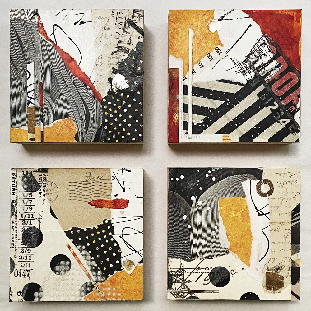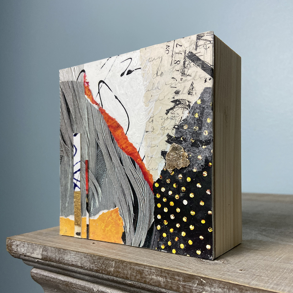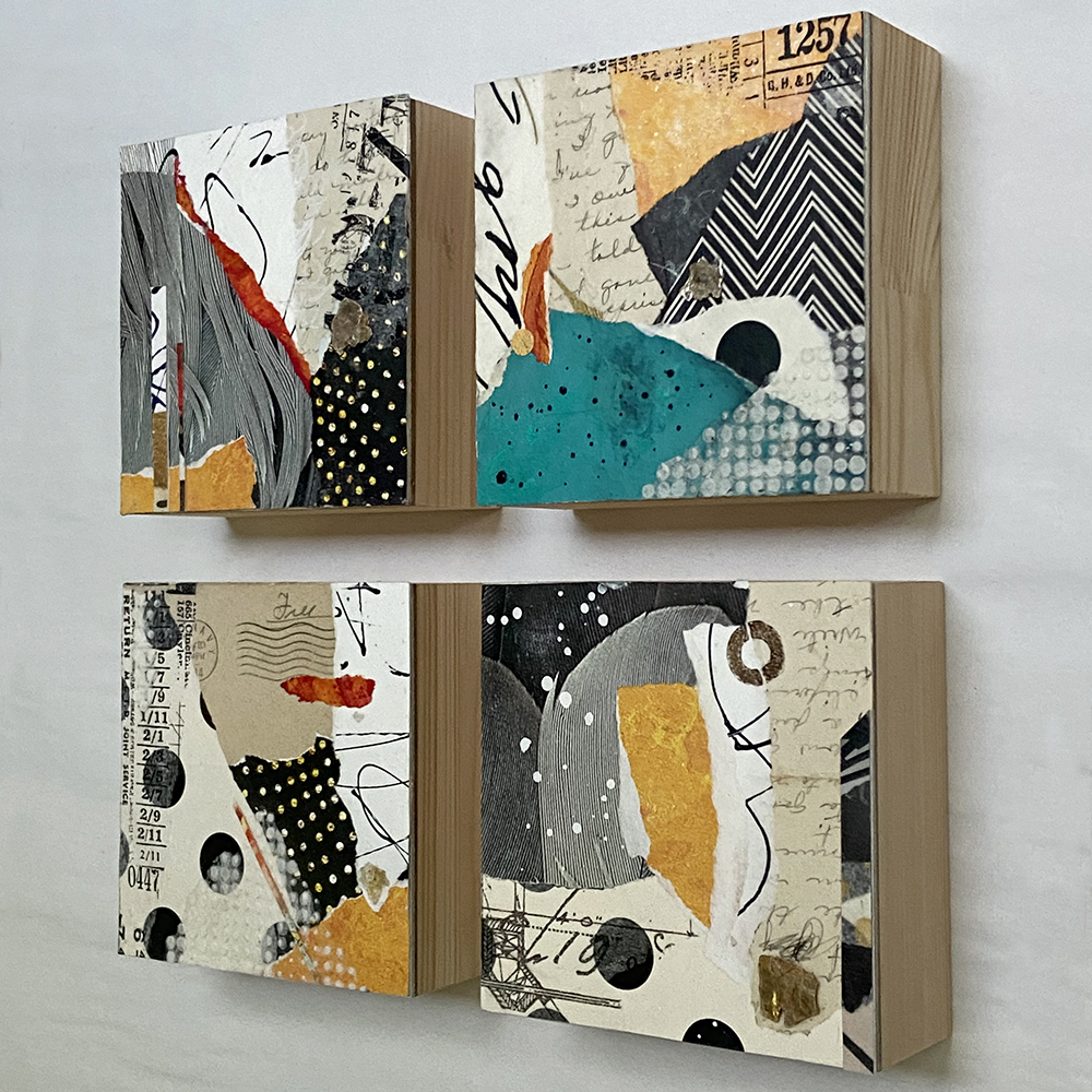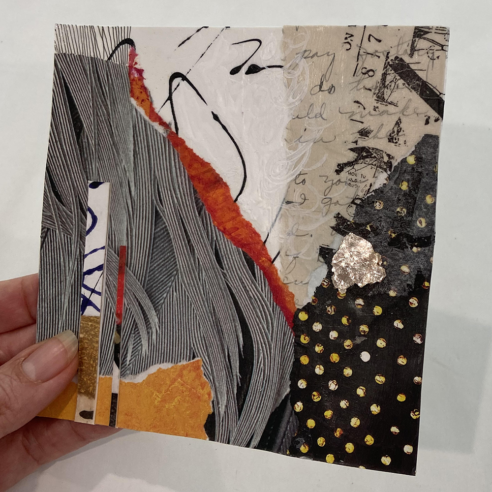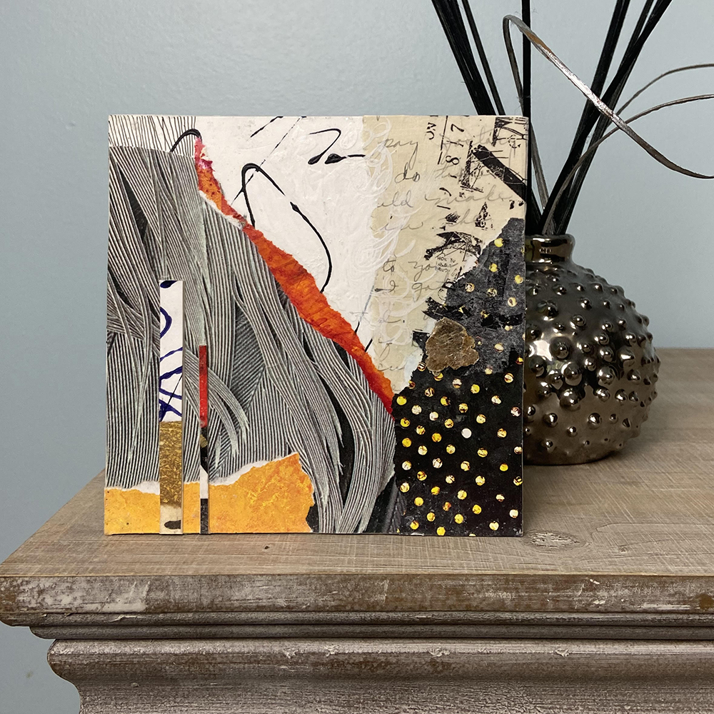 - Created with hand-painted monoprints, collage papers, and acrylic paint