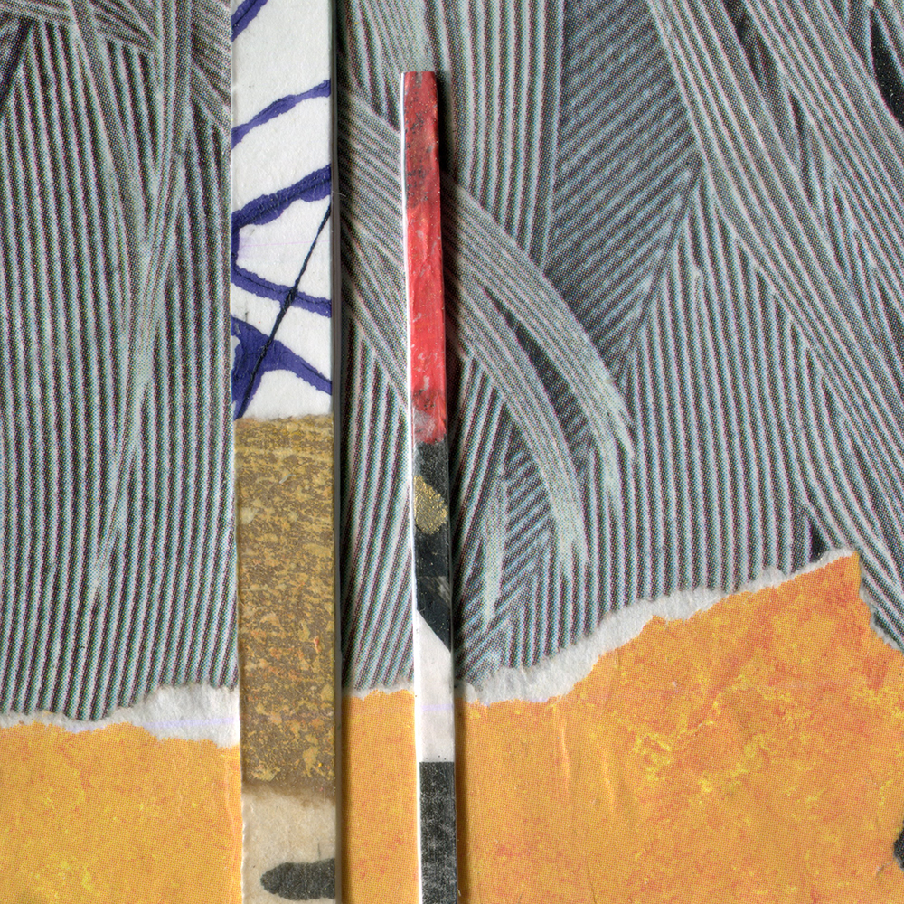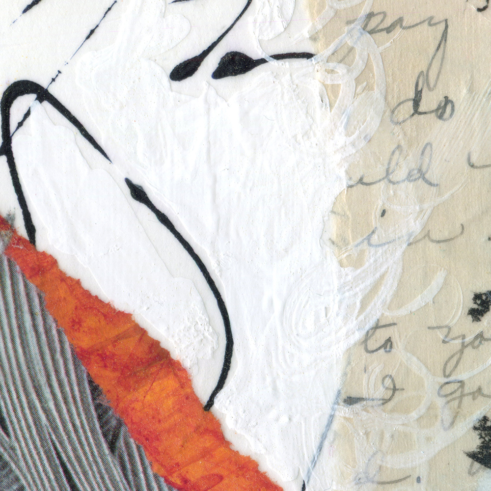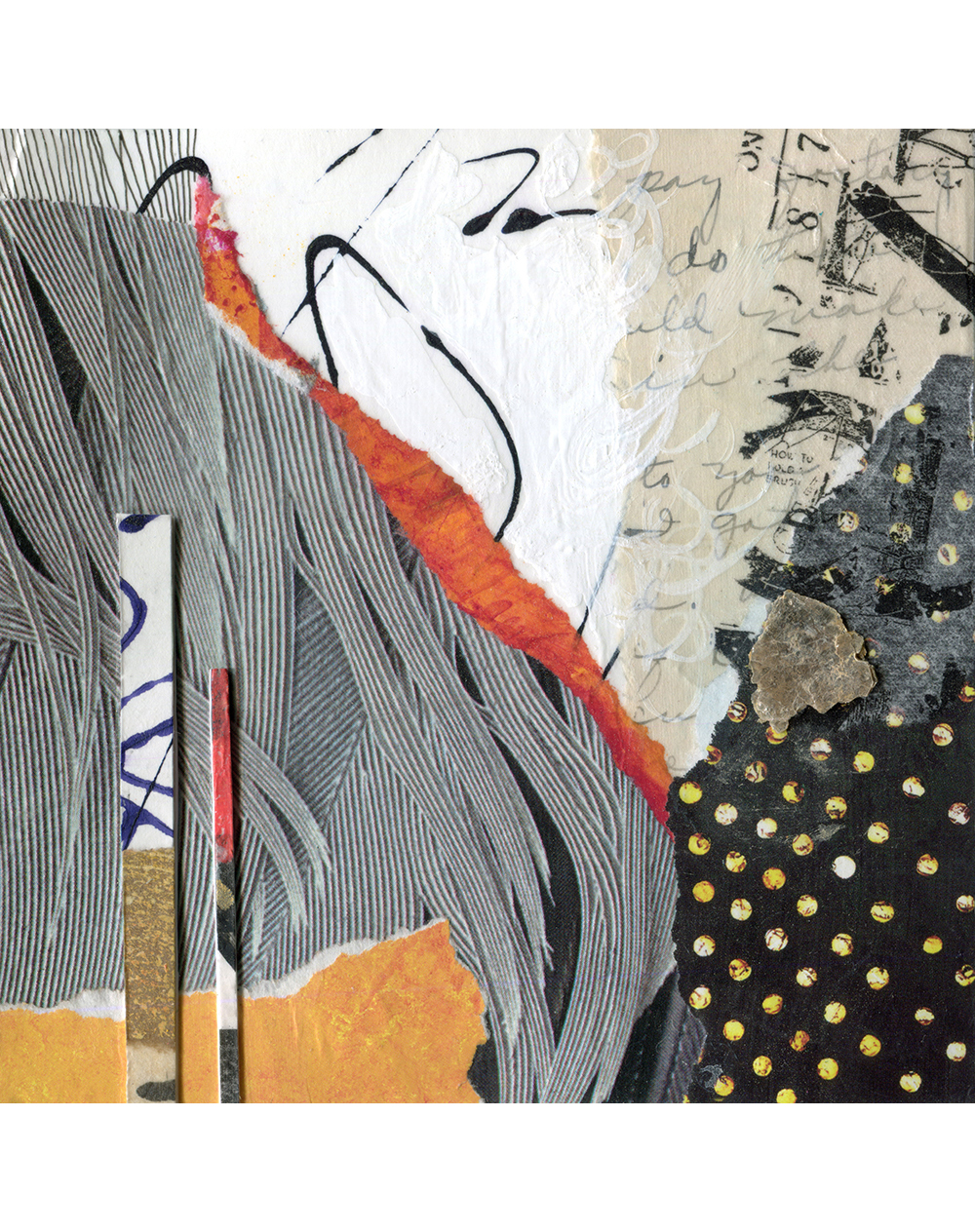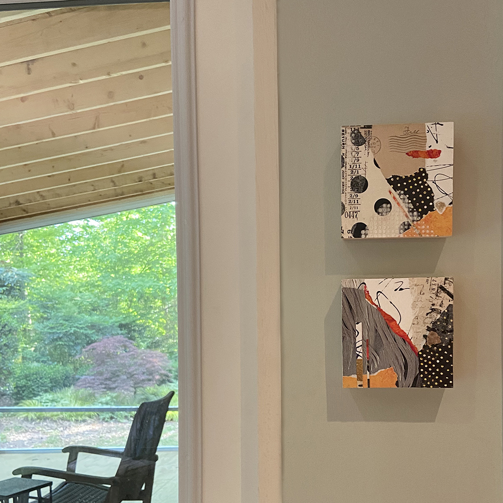 - Created with hand-painted monoprints, collage papers, and acrylic paint