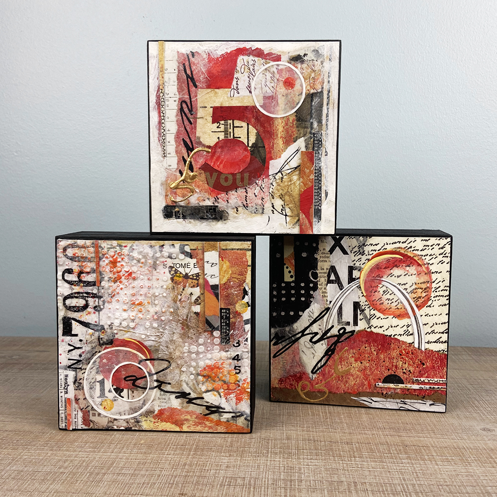 - Created with hand-painted monoprints, collage papers, and acrylic paint