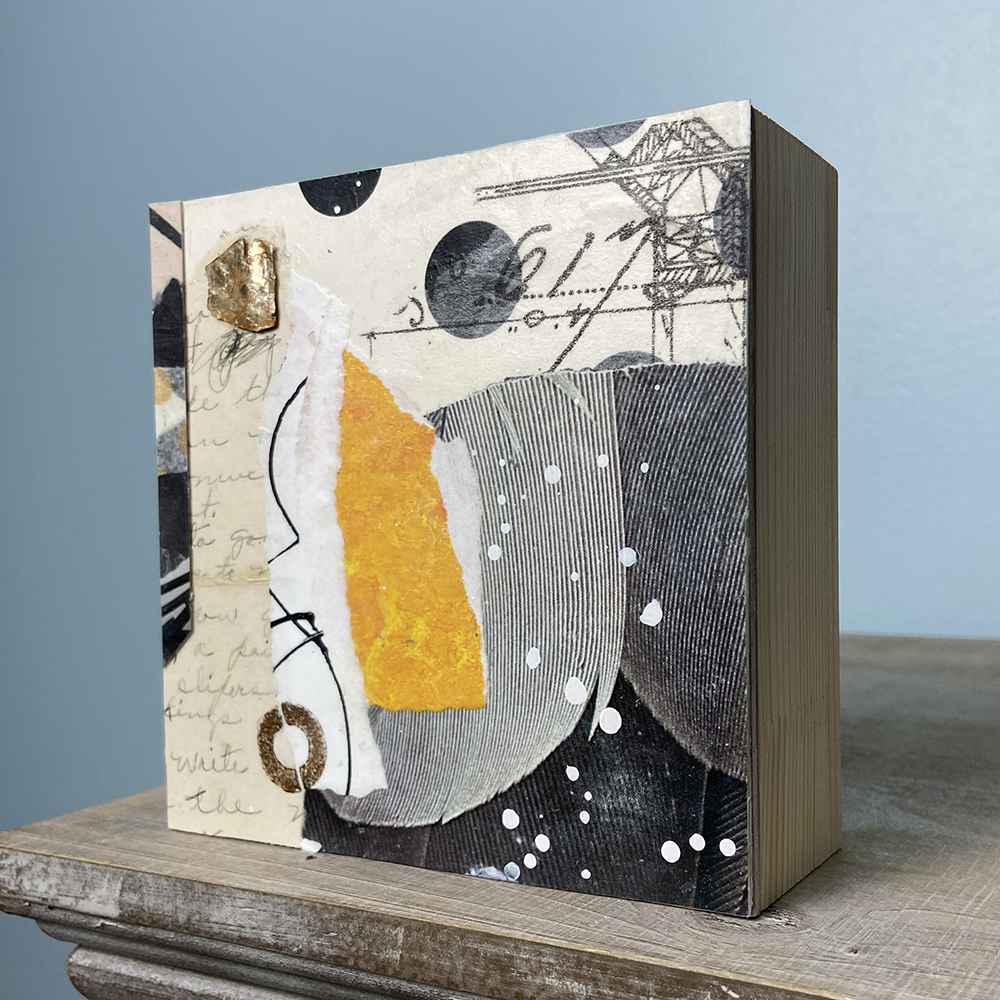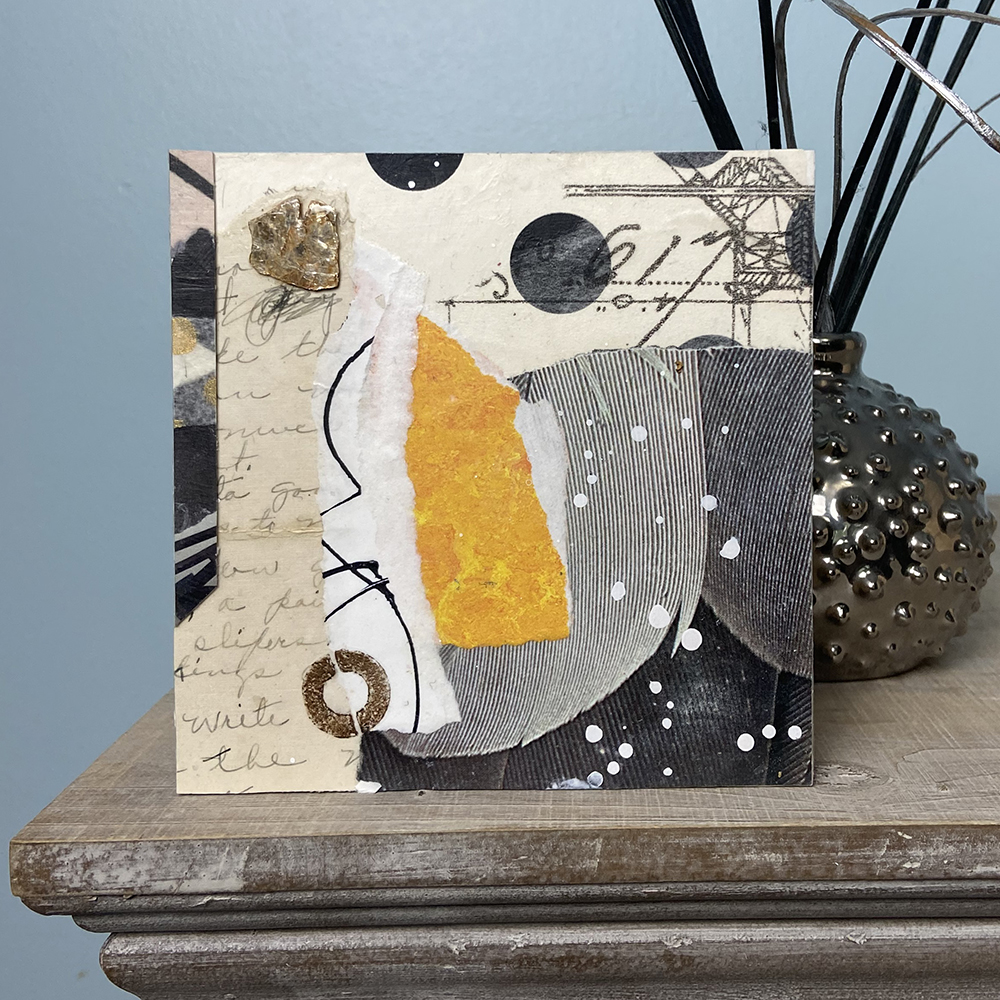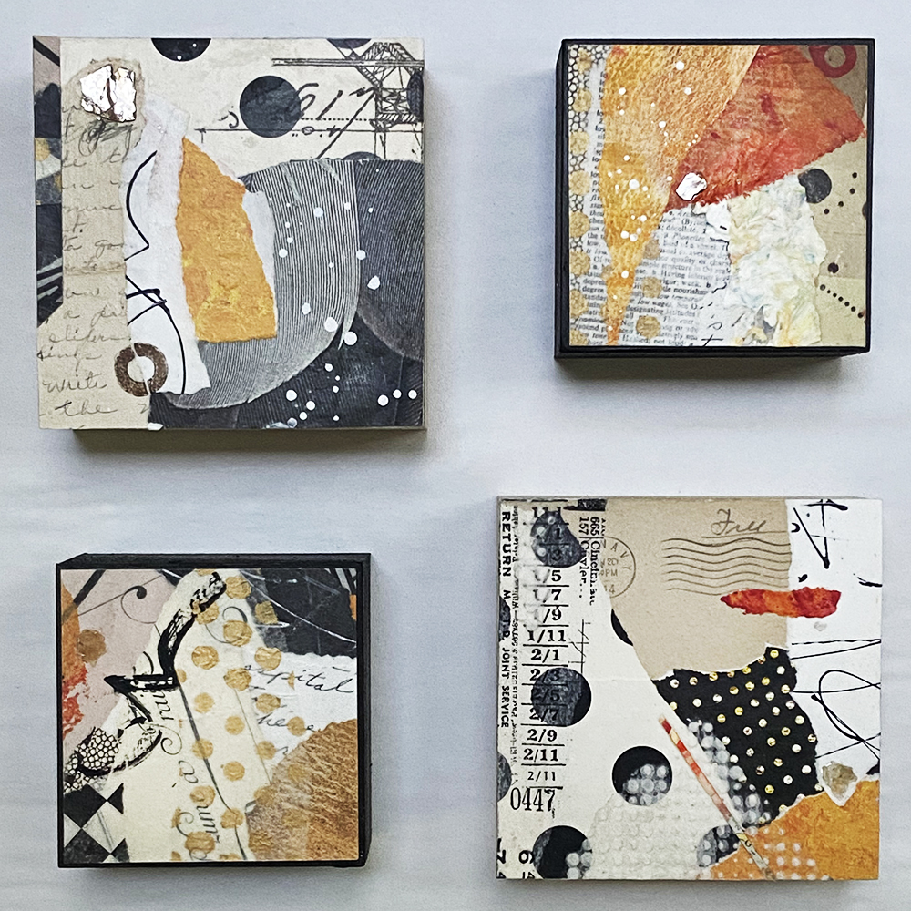 - Created with hand-painted monoprints, collage papers, and acrylic paint
