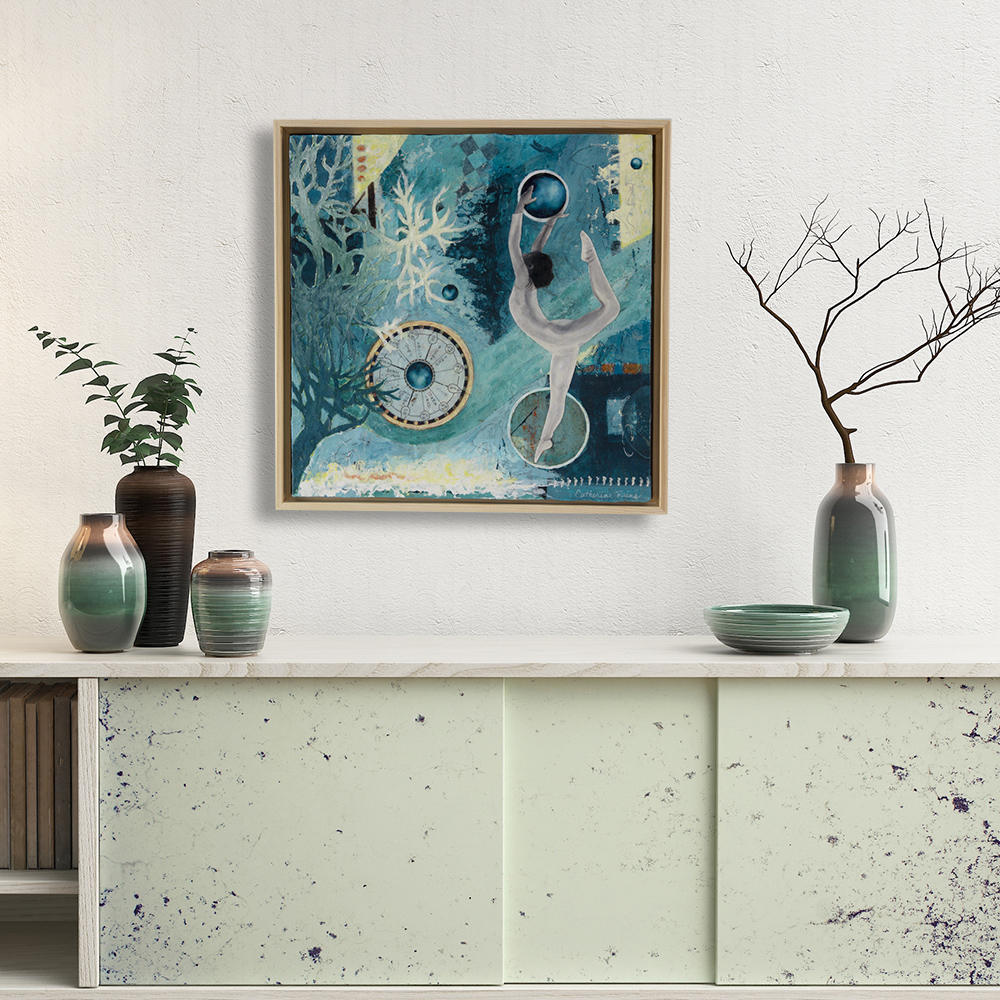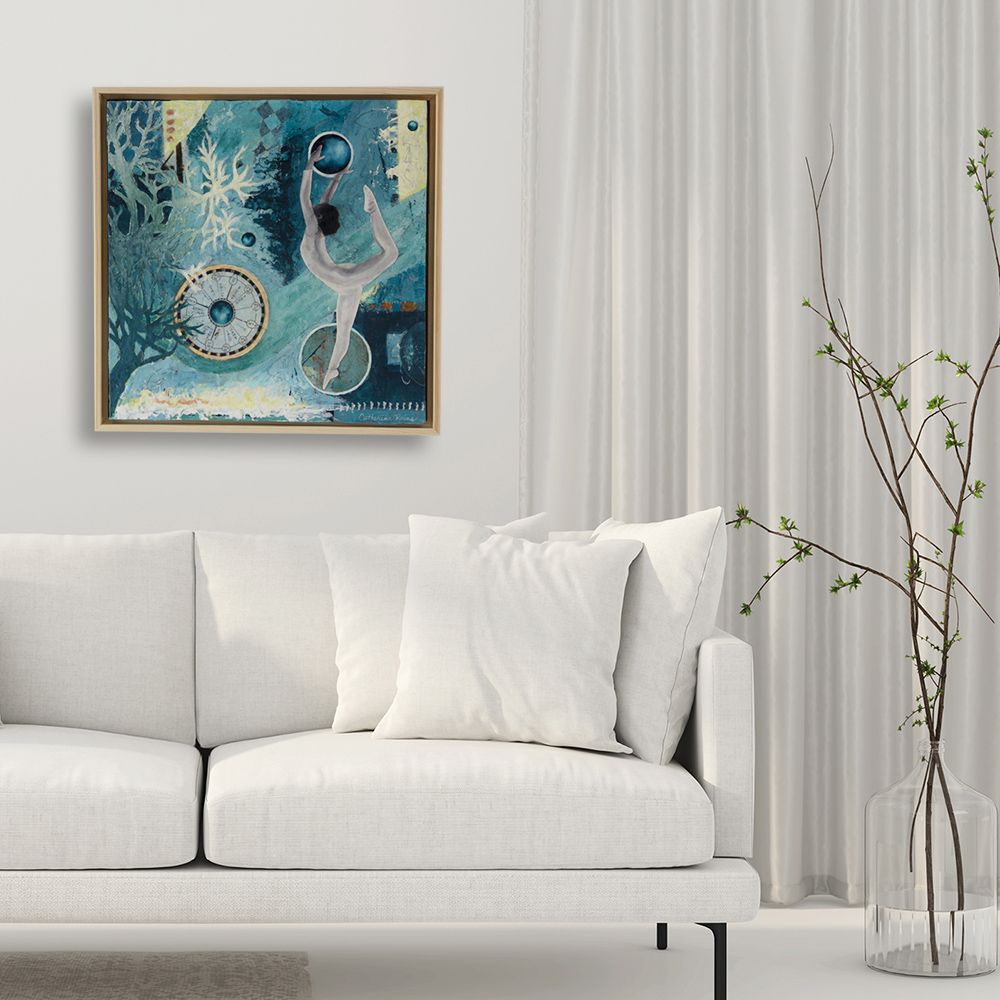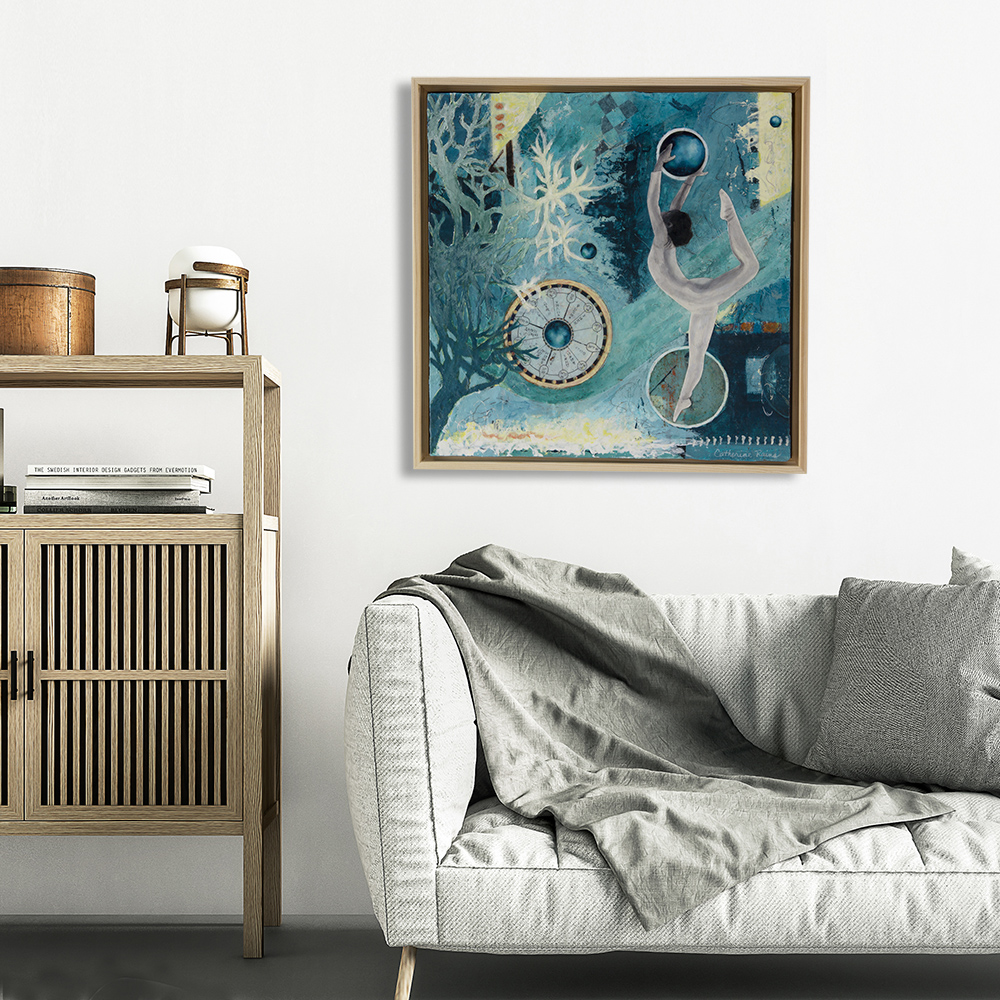 - Includes natural wood floater frame, wired to hang on a wall or stand alone on a shelf or mantle