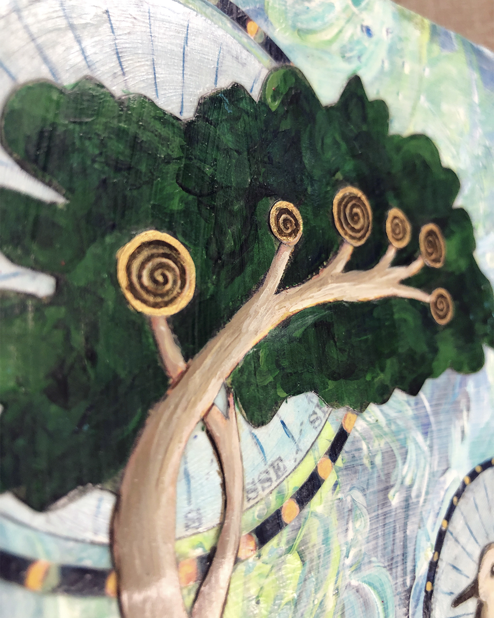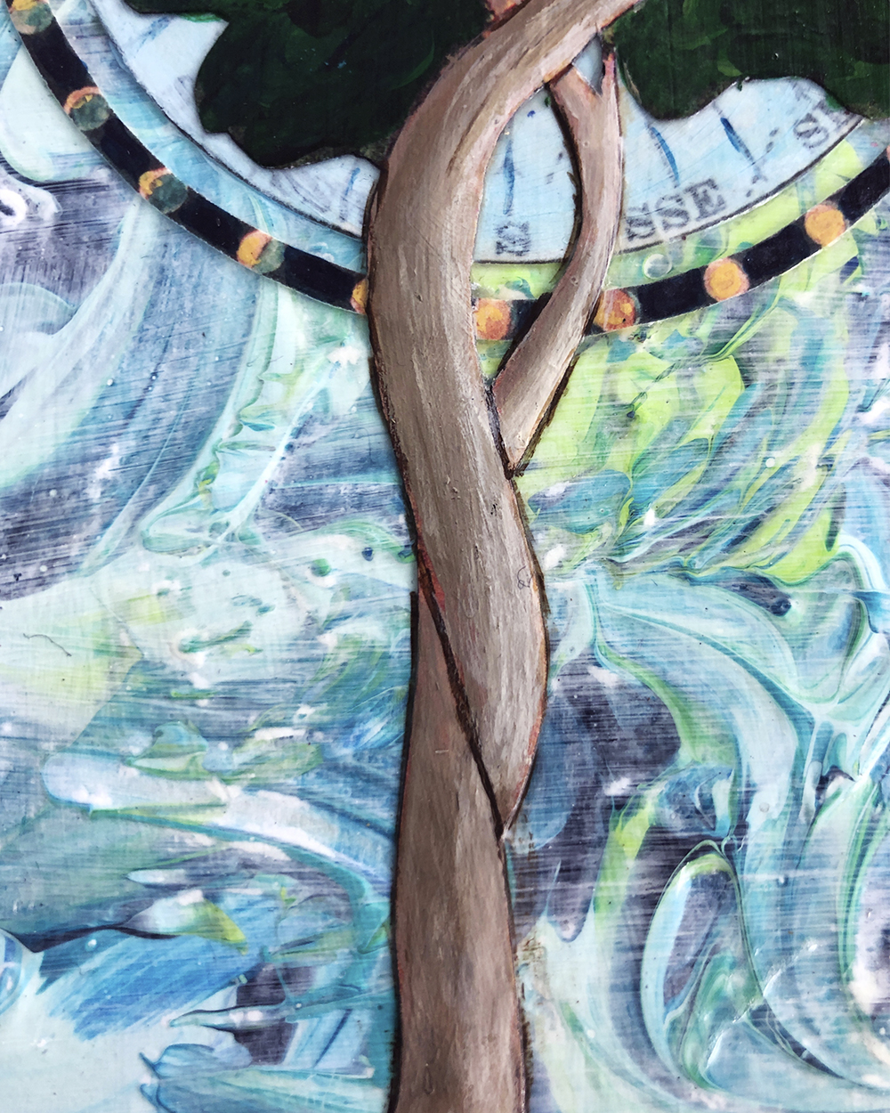 - Created with acrylic, ink, and paper on 1.5″ cradled hardwood panel