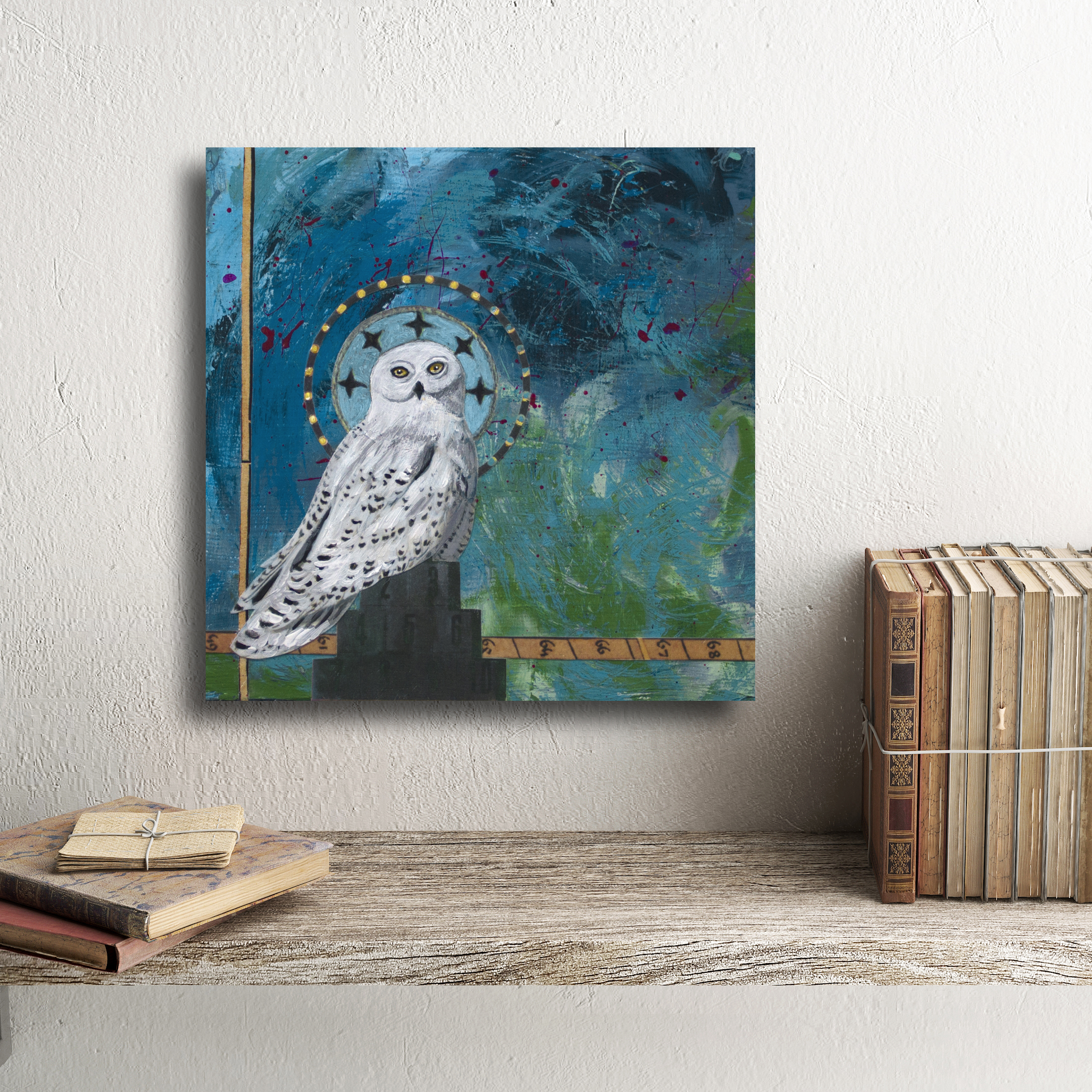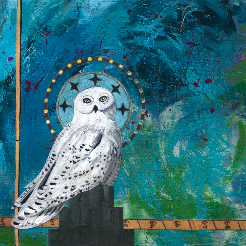 - Created with acrylic, ink, and paper on cradled hardwood panel