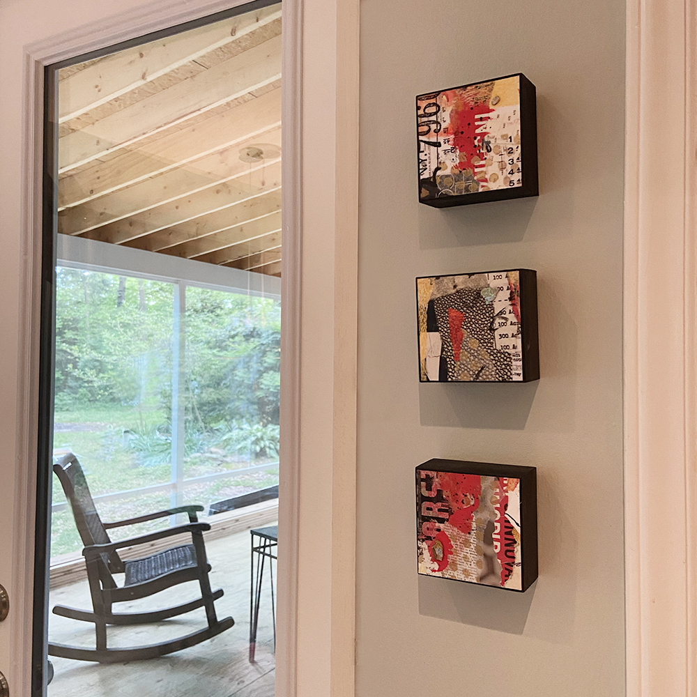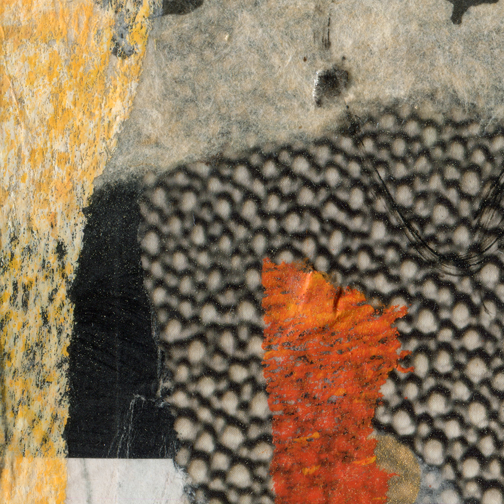 - Created with hand-painted monoprints, collage papers, and acrylic paint