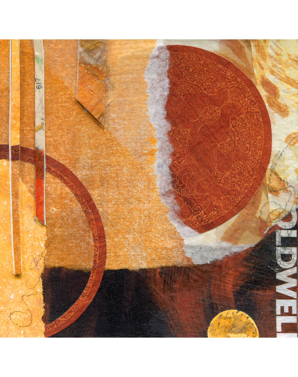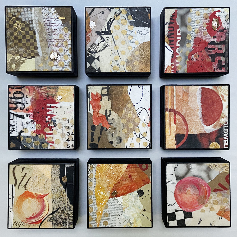 - Created with hand-painted monoprints, collage papers, and acrylic paint