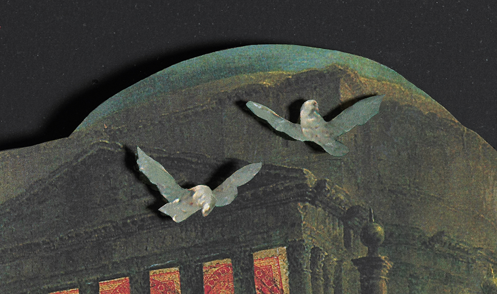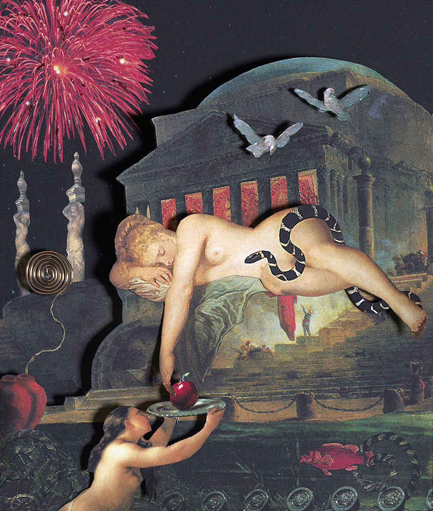 I first named this collage “Original Sin”, but soon changed it as I never bought into the negative interpretation of what happened when Eve was tempted to eat the apple. I choose to believe that the apple represents something altogether different, such as in Greek mythology where it is associated with Aphrodite the goddess of love. However, my favorite interpretation of the apple is as a symbol of “the all”, or “the complete”, which we all are. Perhaps the word temptation really meant “test”, as in a test-ament to who and what we truly are, all one. Hence, Eve was being drawn to discover her true nature, being one with God, and to help Adam to do the same.