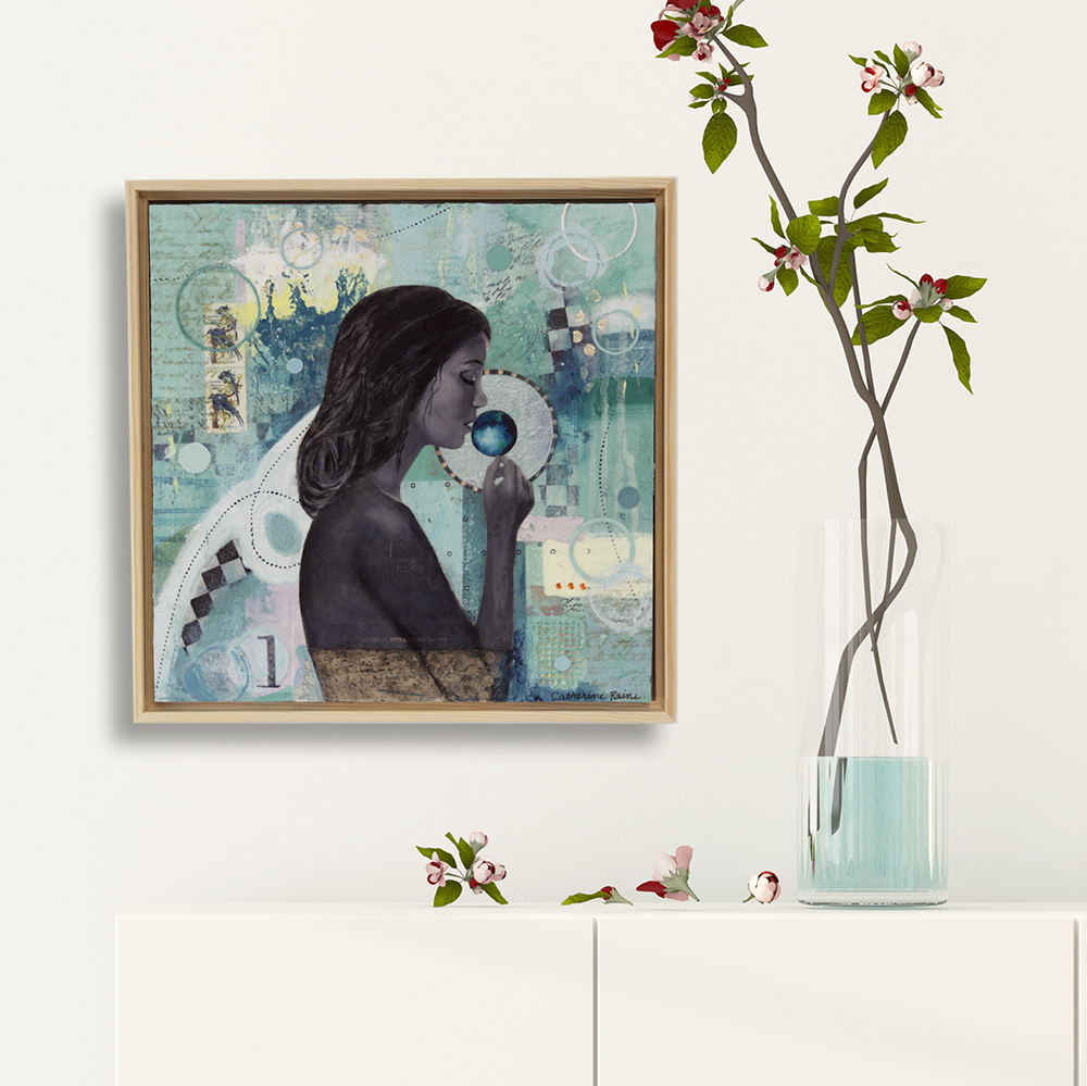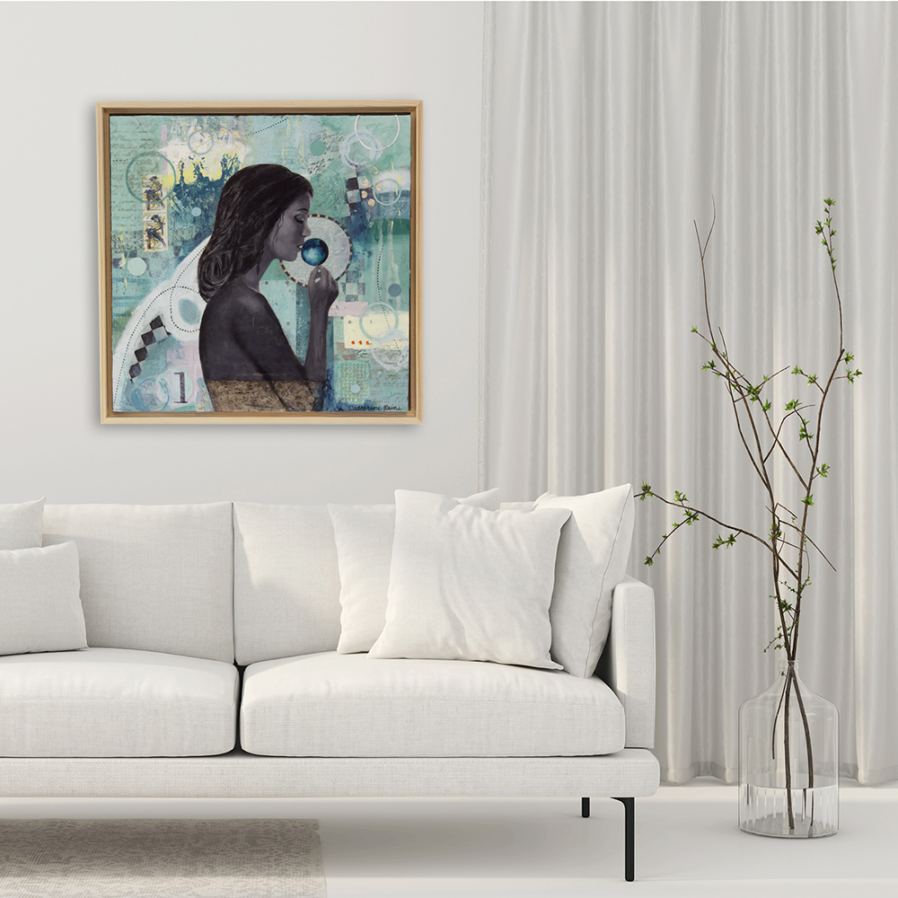 - Includes natural wood floater frame, wired to hang on a wall or stand alone on a shelf or mantle