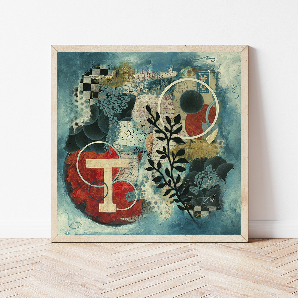 • Natural wood floater frame, wired to hang on a wall or stand alone on a shelf or mantle