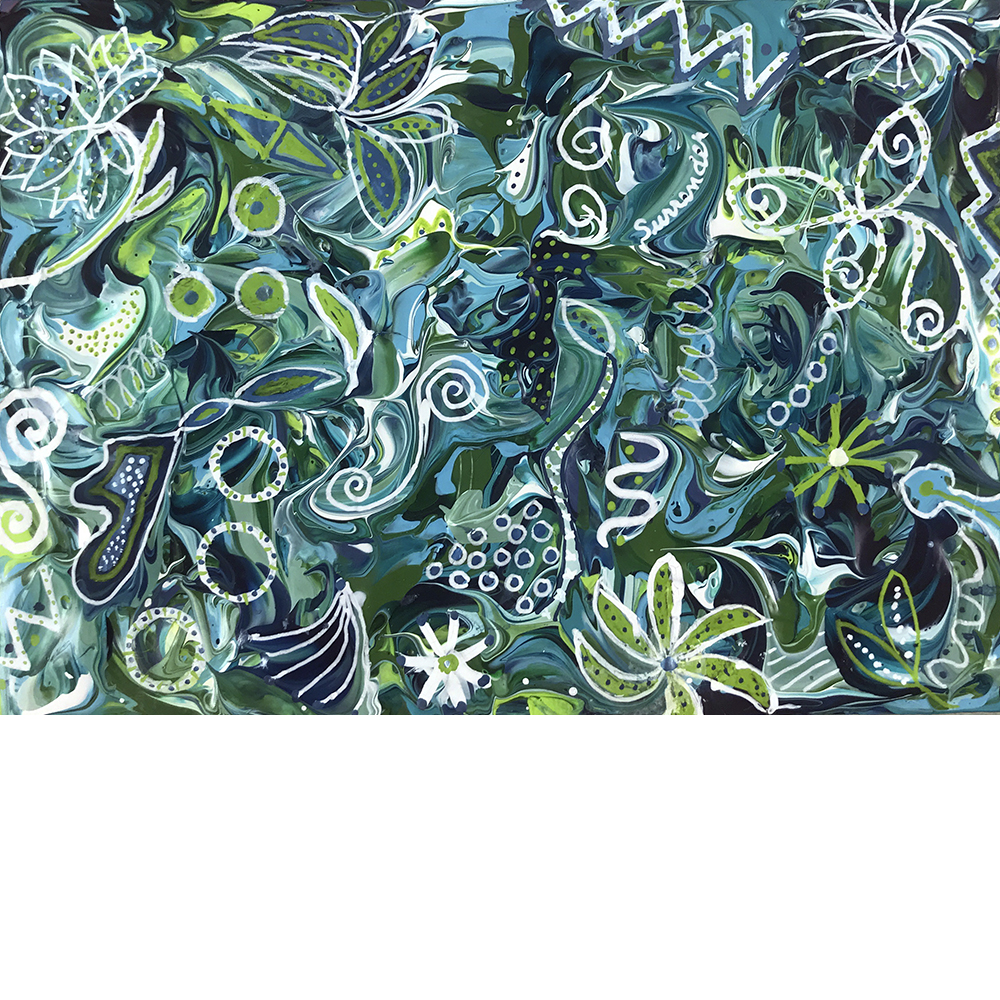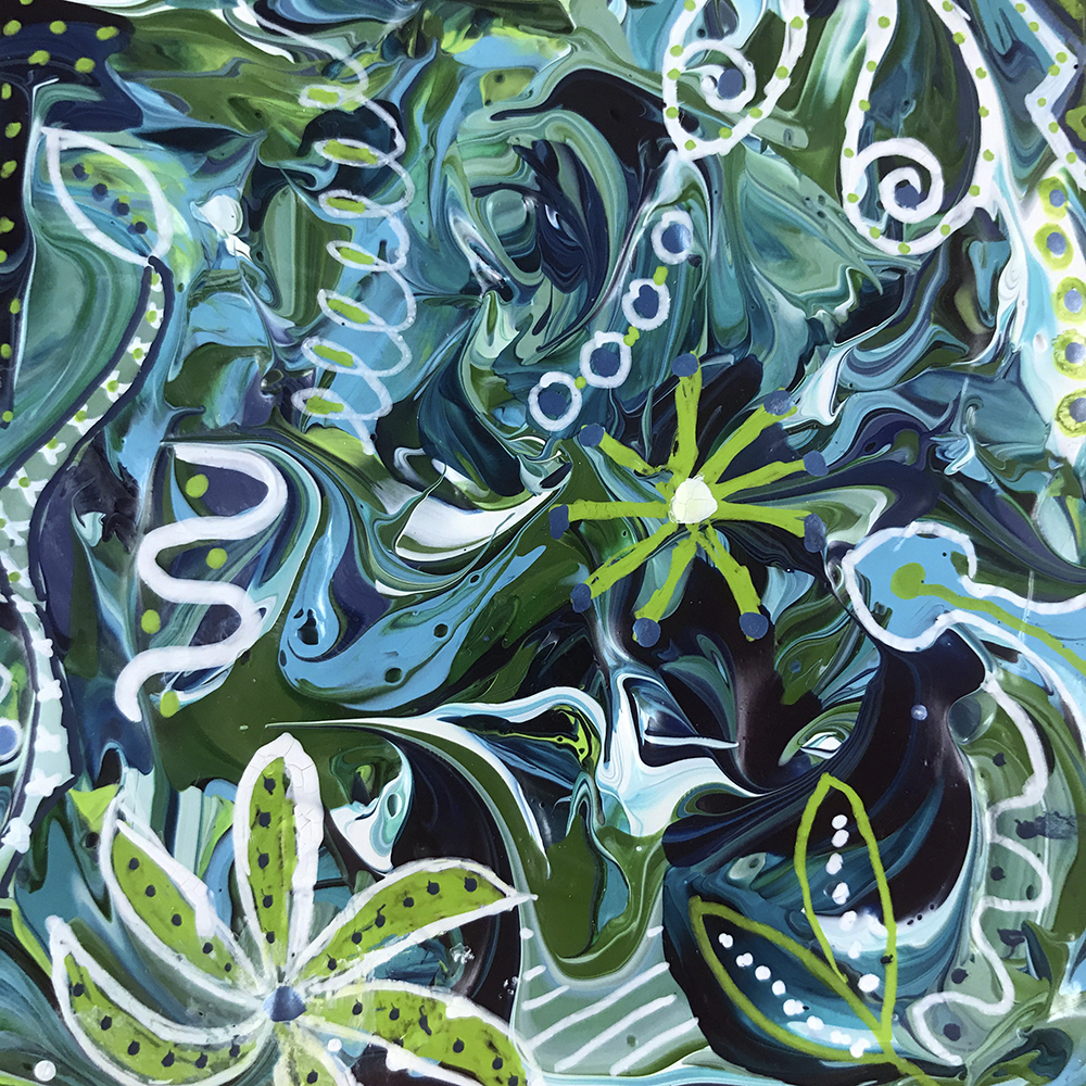 Every abstract painting in the “Hidden Blessings” collection has a blessing embedded into the painted design, and is intended to inspire and support the path of the person who holds it with the energy of this word.
