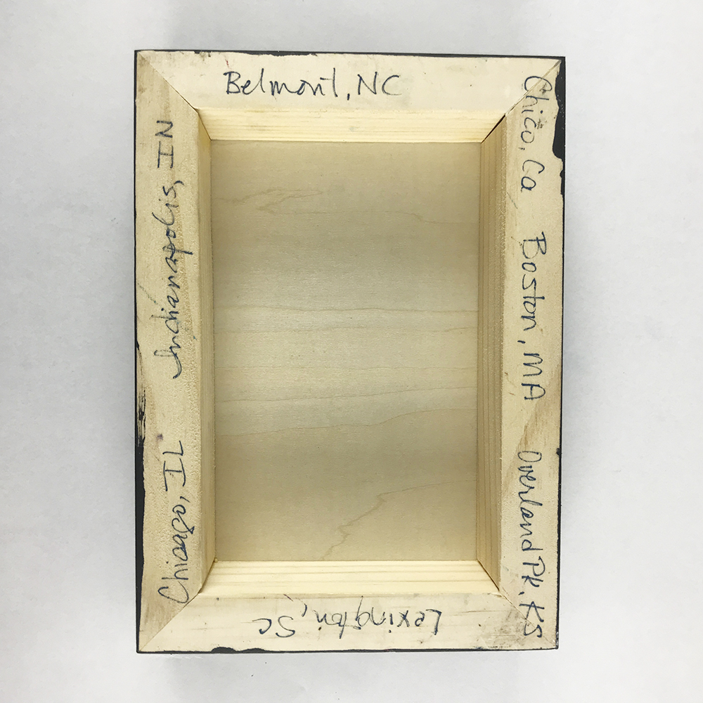 - The 7 cities this collage traveled to in the process of its creation are written on the back edge