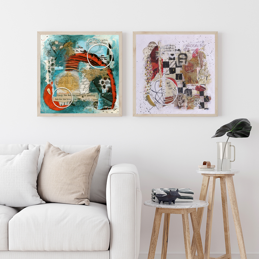 - DYI – Place double sided tape on back of artwork. Position collage on the provided mat in the middle of an 8″x8″ frame, or in an 5″x7″ or 8″x10″ frame equal distant from the top and two sides. Glass not necessary.
