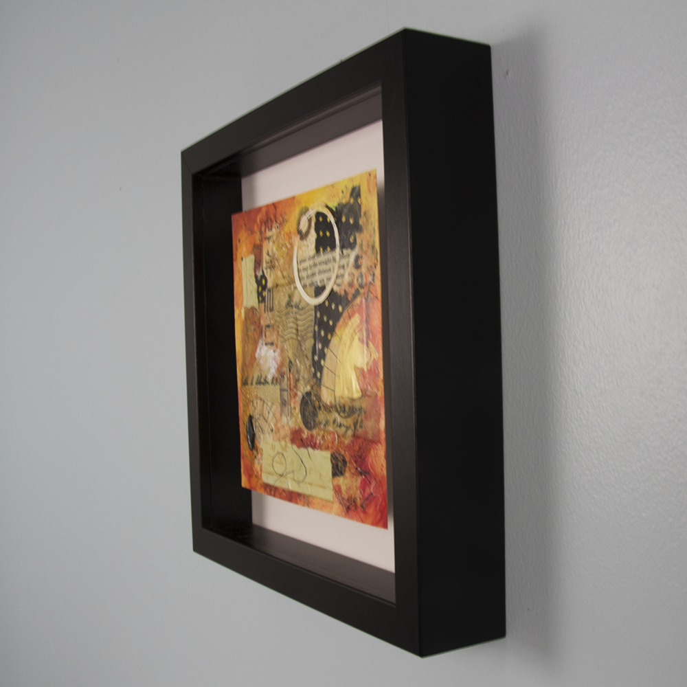 - DYI – Place double sided tape on back of artwork. Position collage on the provided mat in the middle of an 8″x8″ frame, or in an 5″x7″ or 8″x10″ frame equal distant from the top and two sides. Glass not necessary.