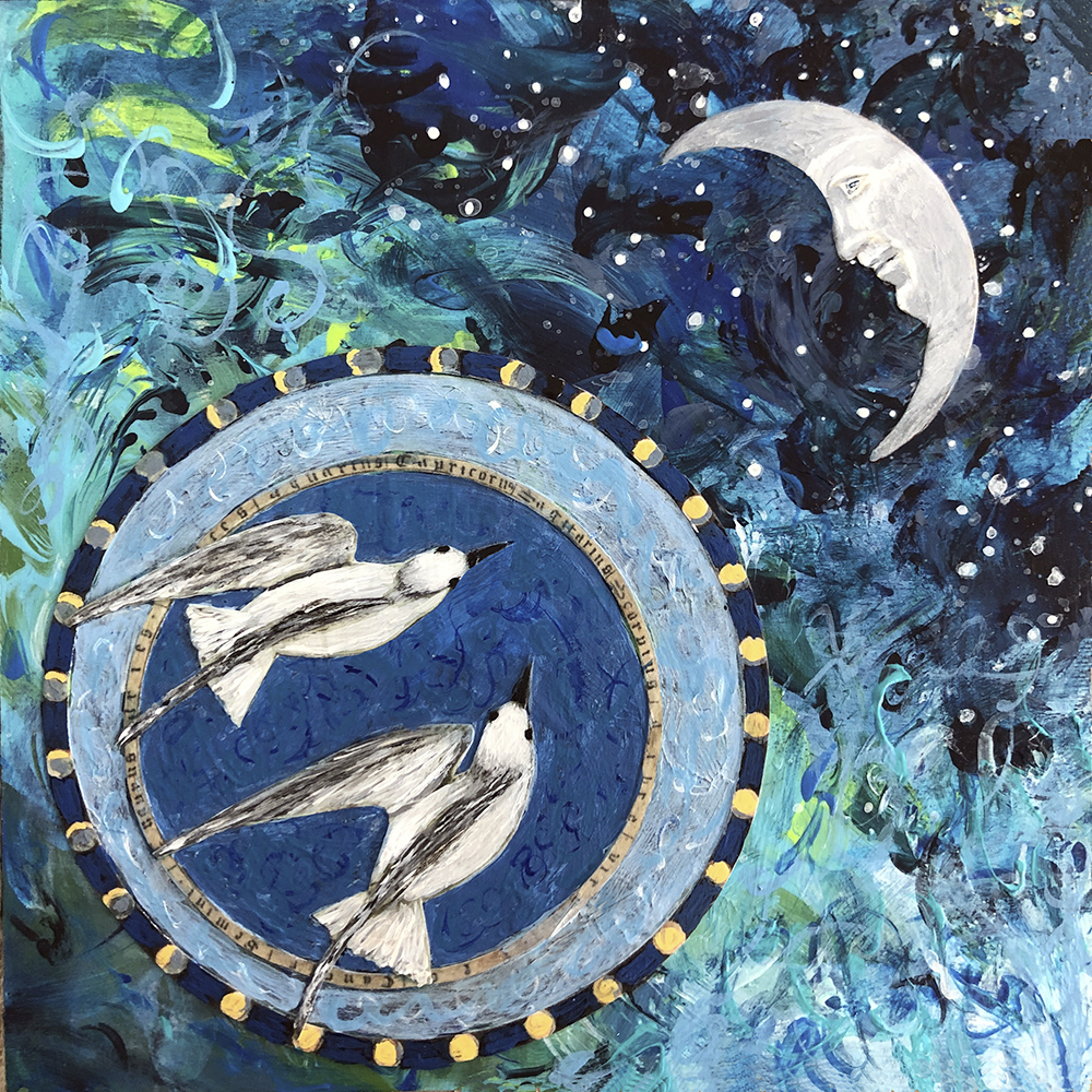 - Created with acrylic, ink, and paper on 1.5″ cradled hardwood panel