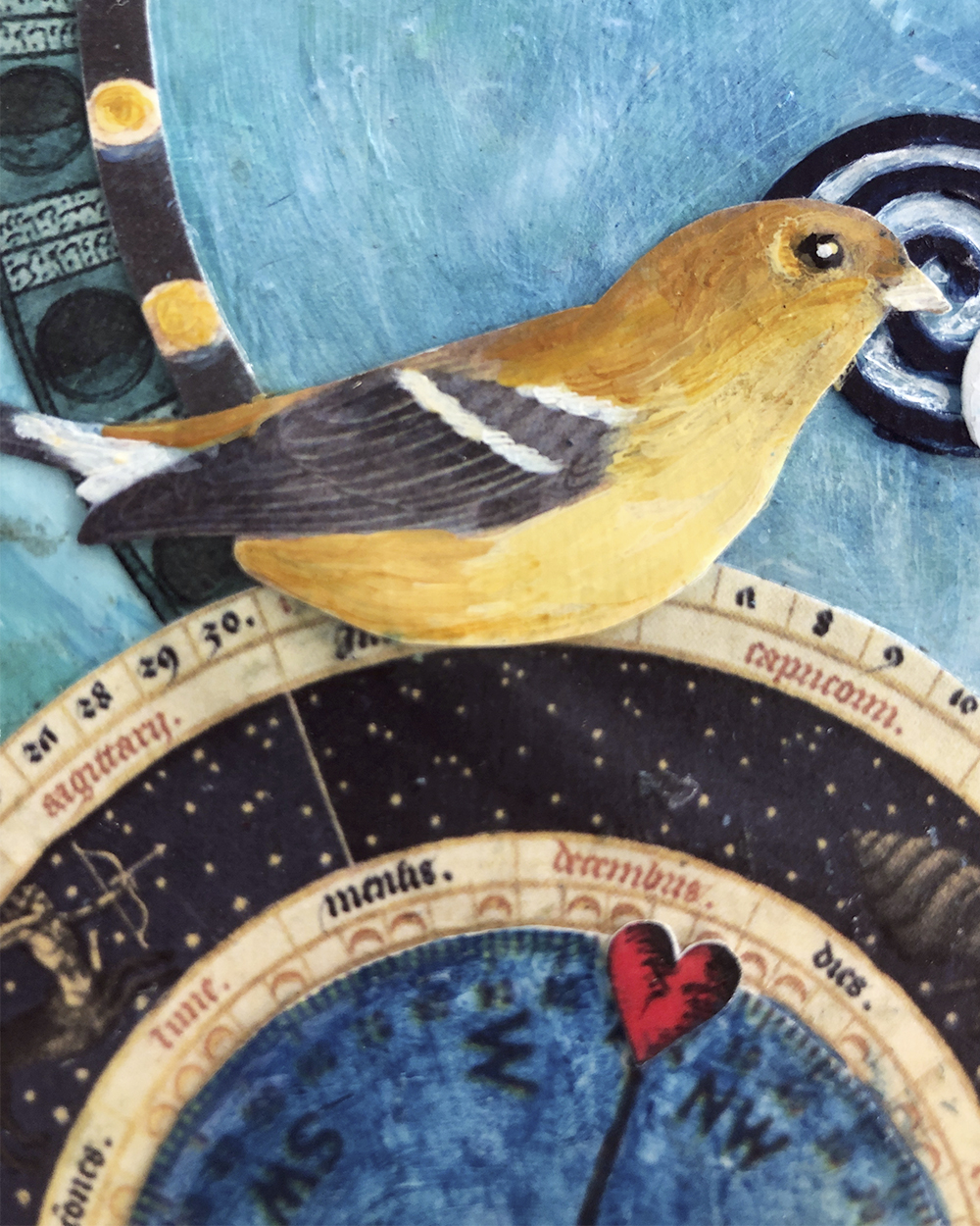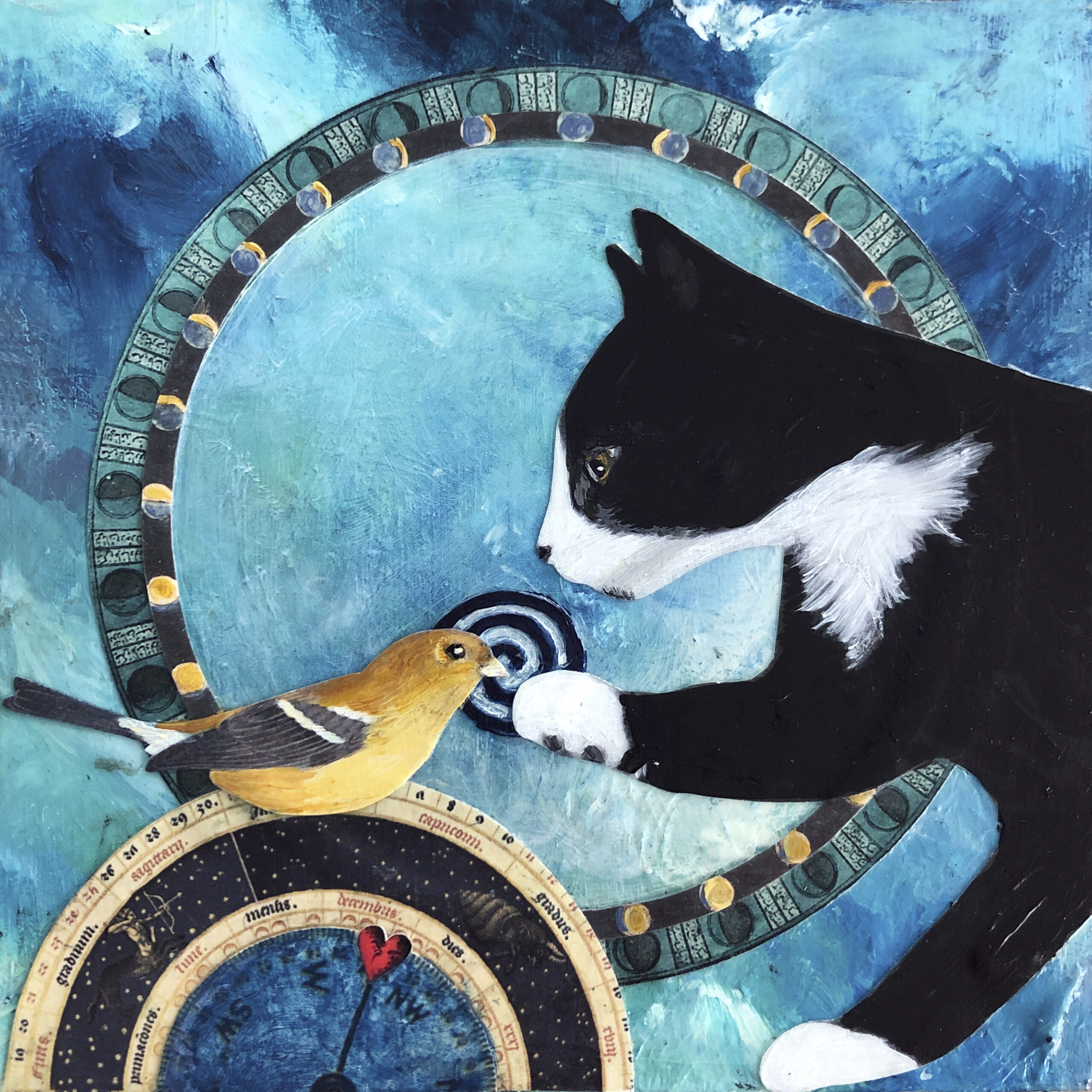 • Created with acrylic, ink, and paper on 1.5″ cradled hardwood panel
