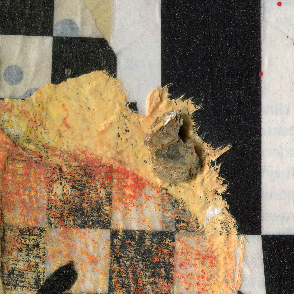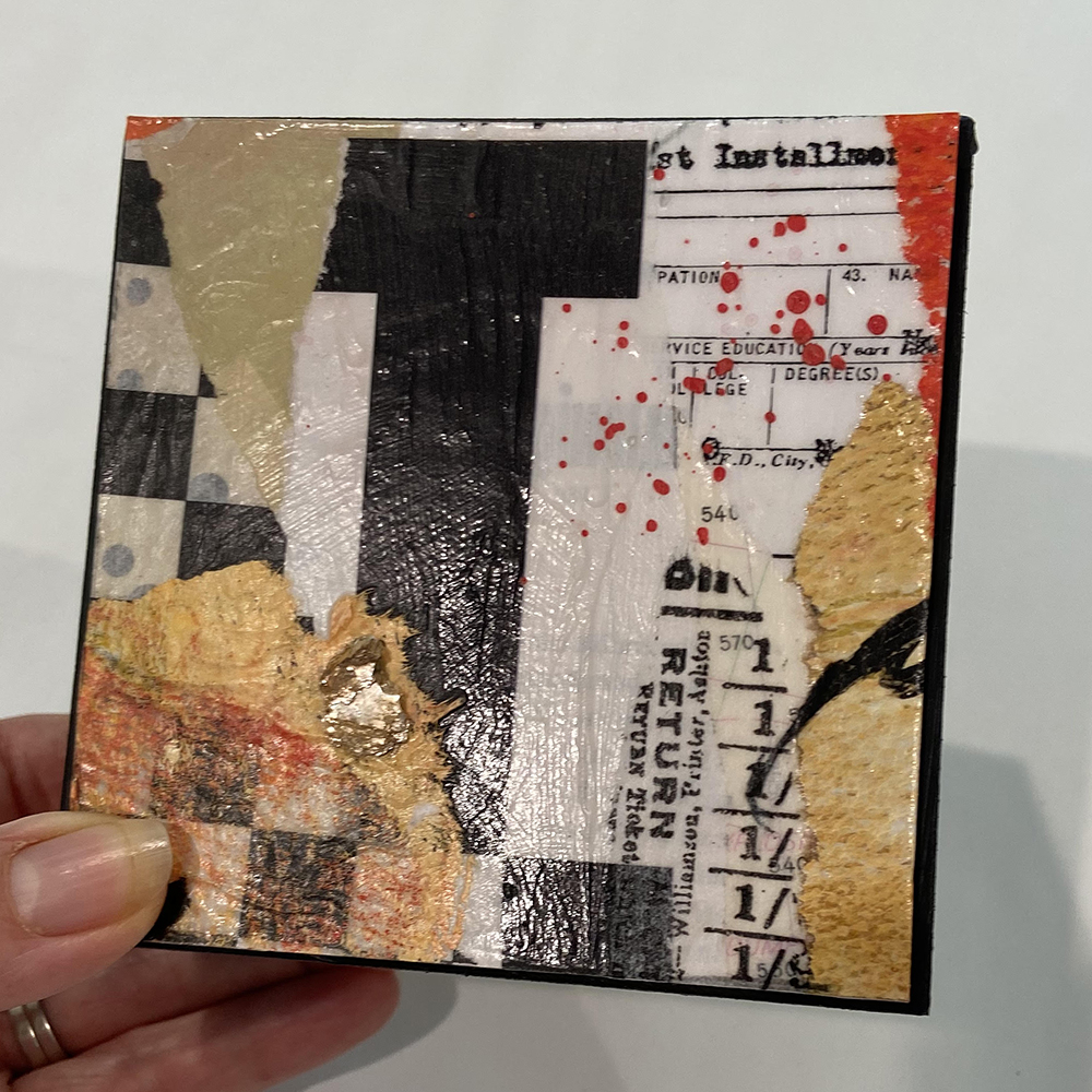 - Created with hand-painted monoprints, collage papers, and acrylic paint