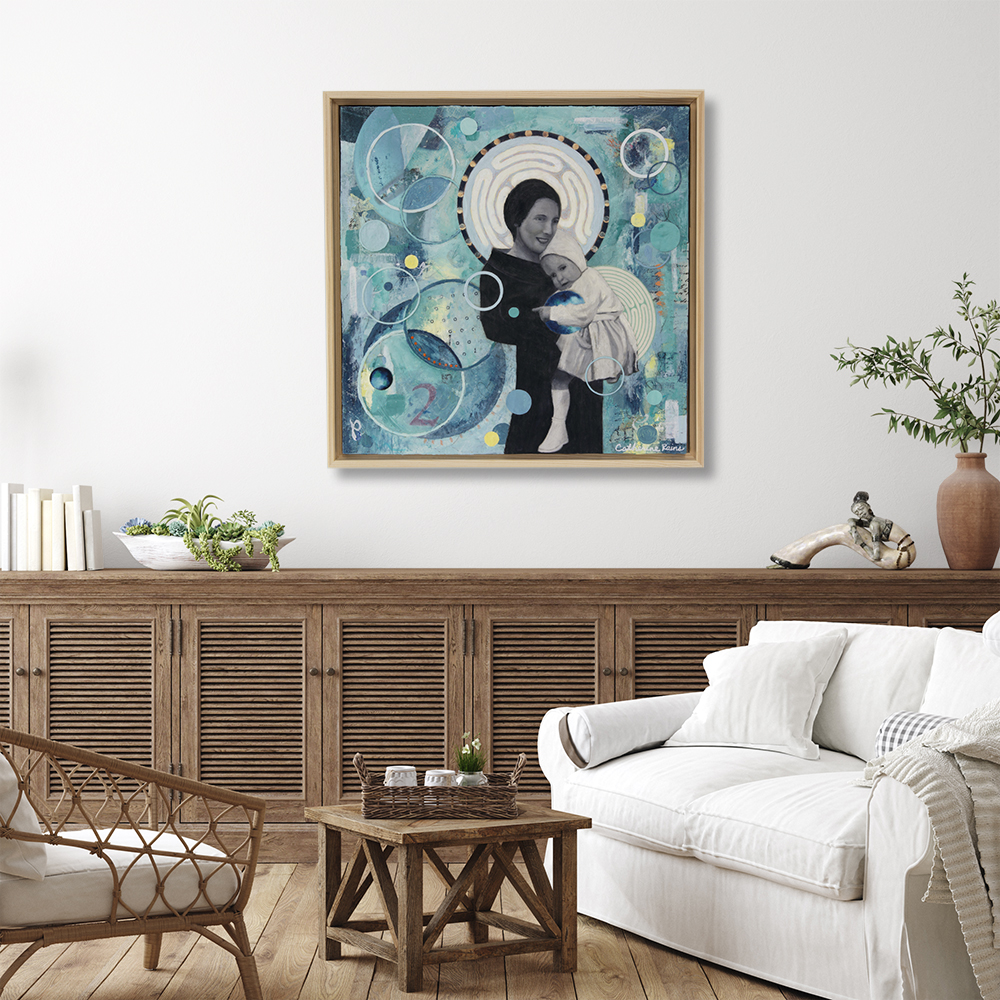 - Includes natural wood floater frame, wired to hang on a wall or stand alone on a shelf or mantle